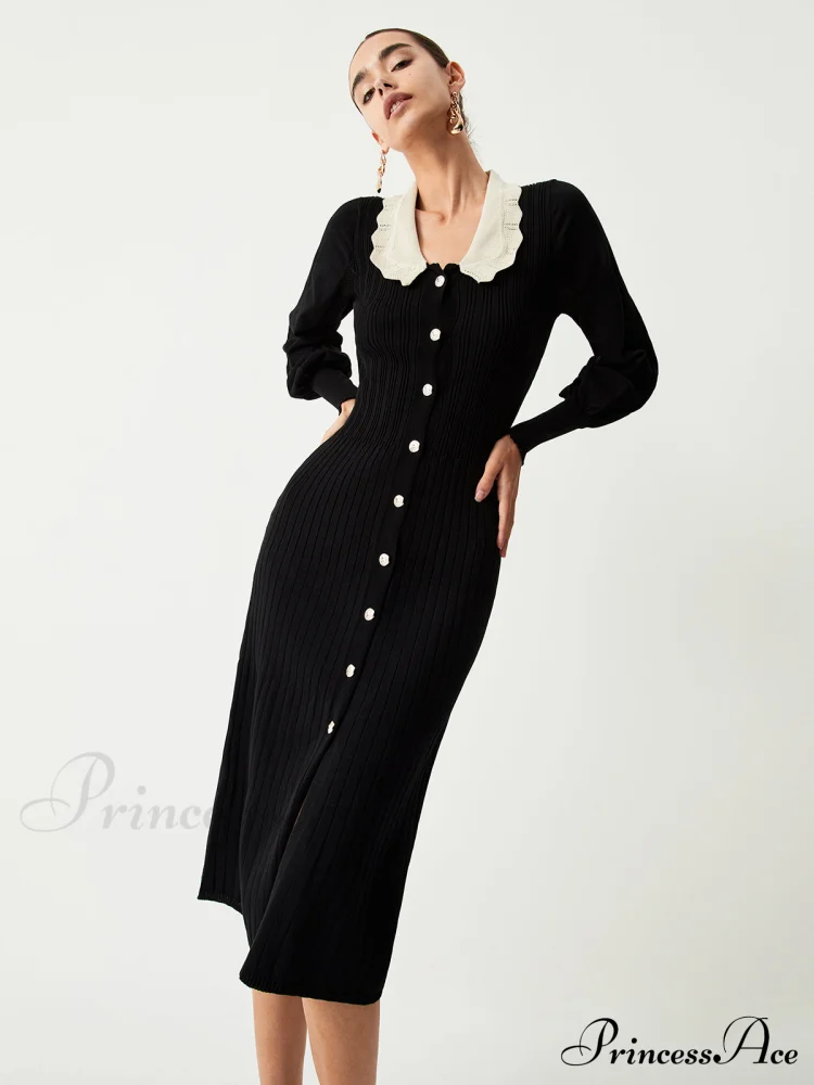 Contrast Eyelet Collar Long Modern Sleeve Midi Sweater Dress